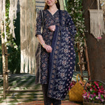 Blue Ethnic Printed Cotton Blend Straight Kurta Pant Dupatta Set (Pre-Order)