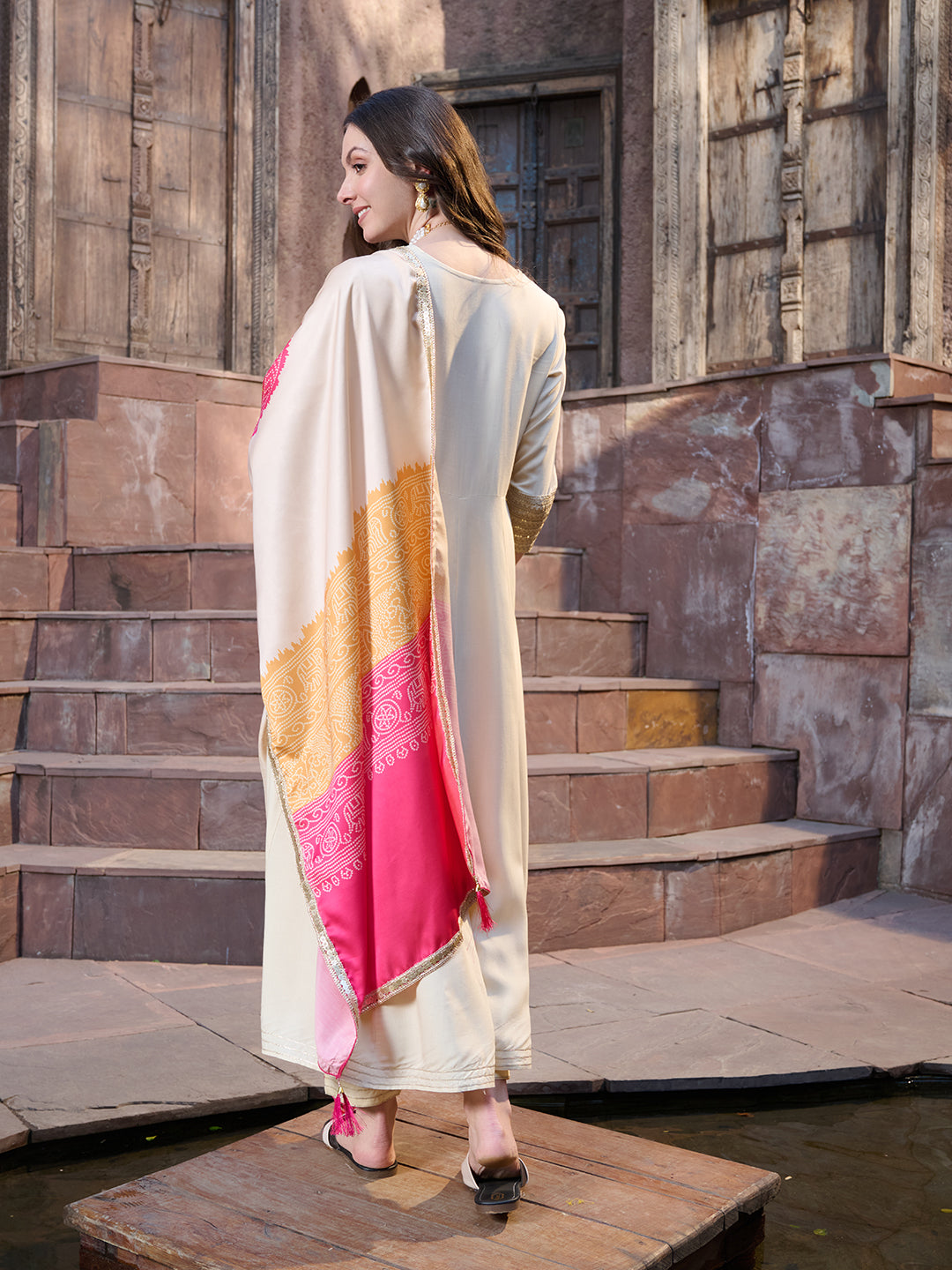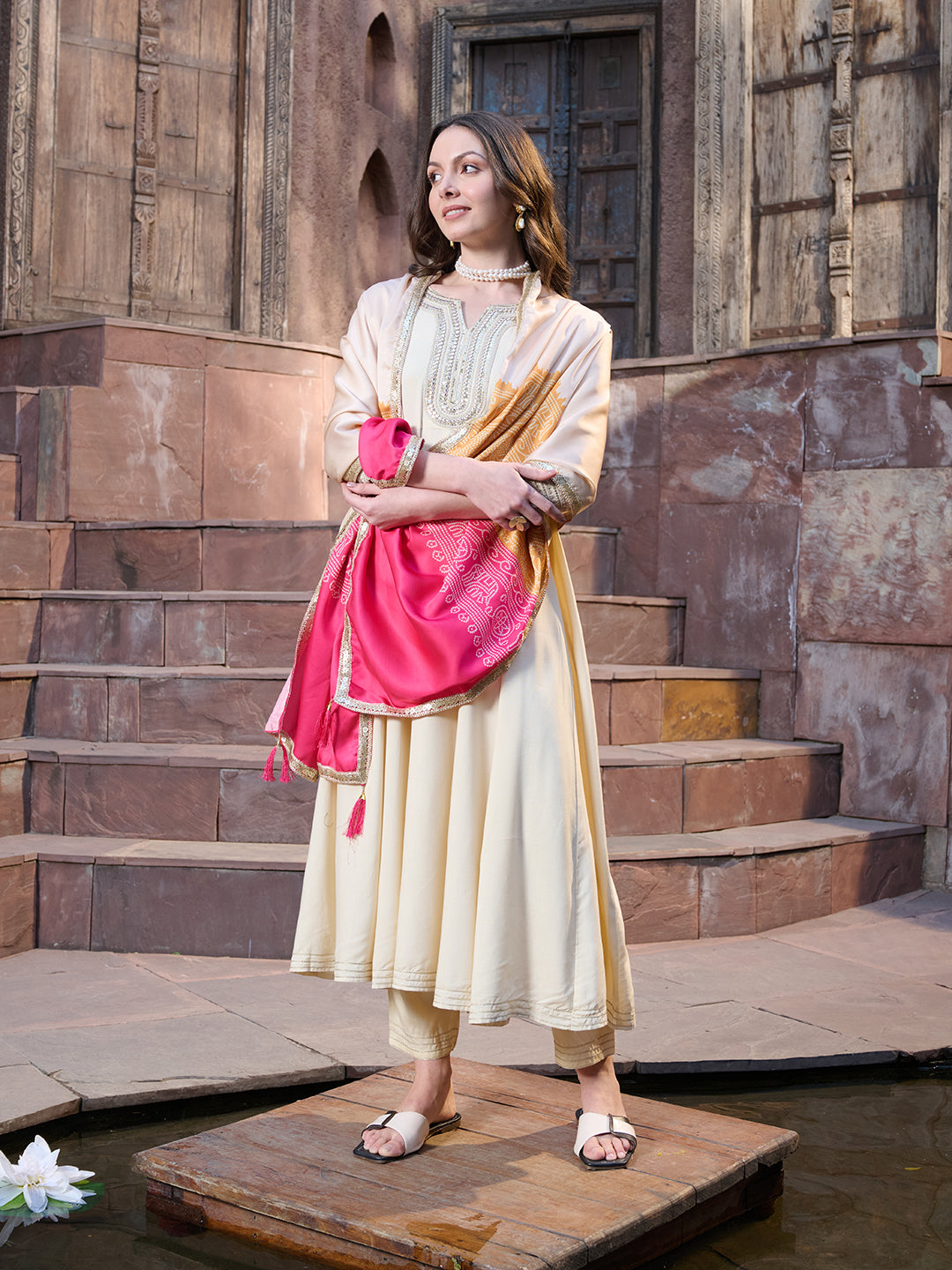 Cream Solid & Embroidered Rayon Anarkali Kurta Pant Dupatta Set (Pre-Order)