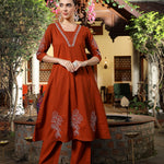 Rust Solid & Embroidered Cotton A-Line Kurta Pant Set (Pre-Order)