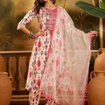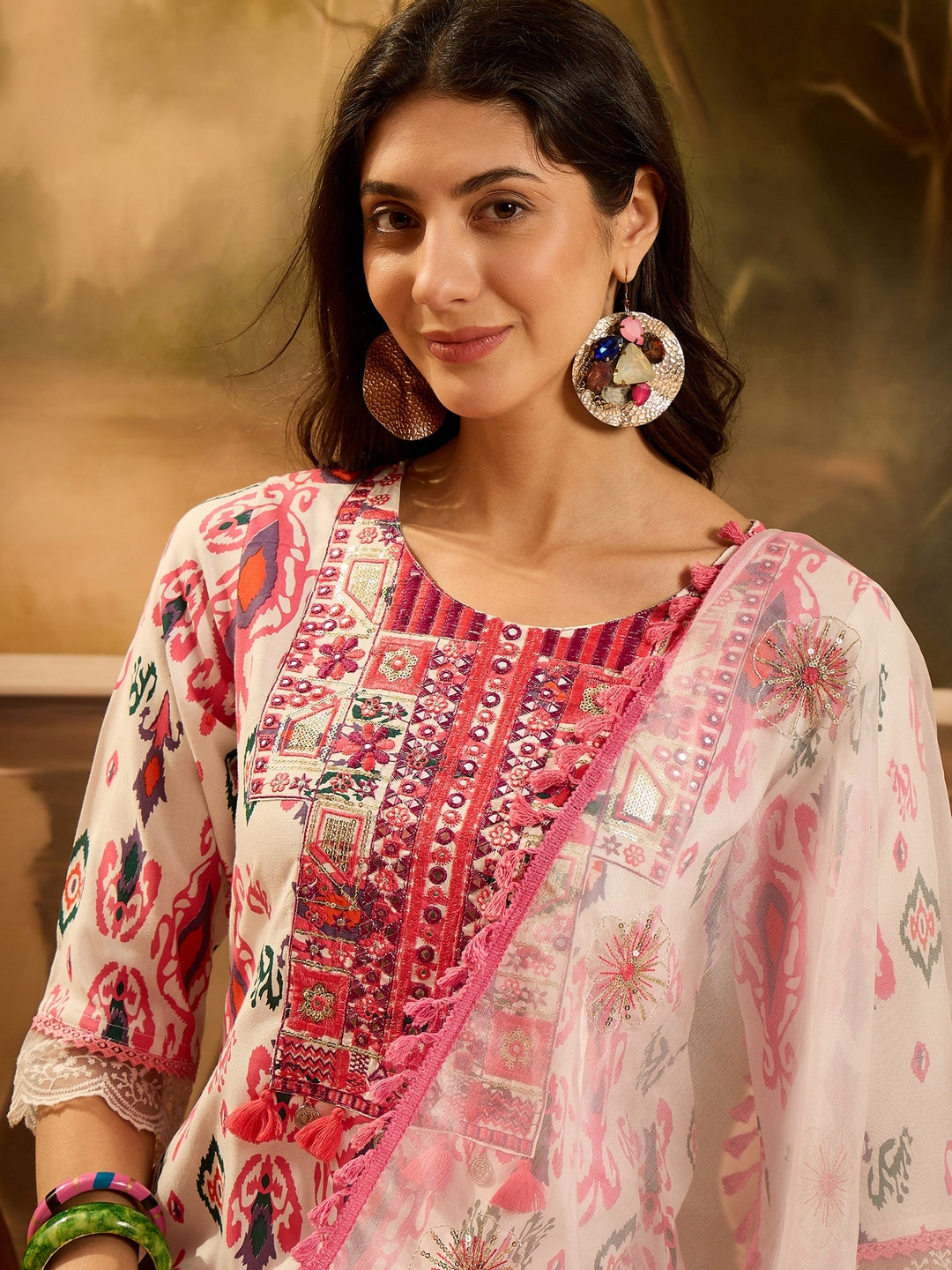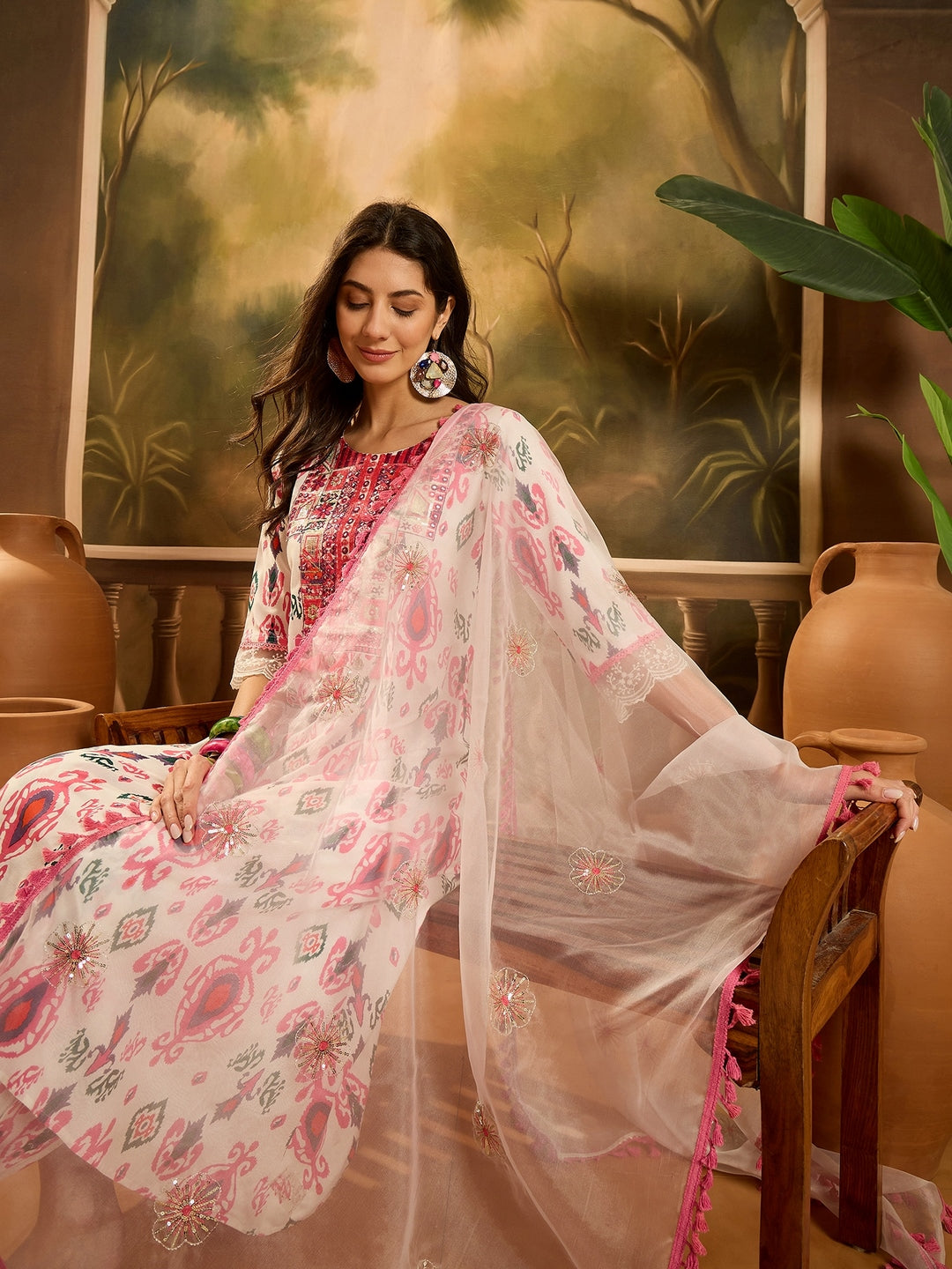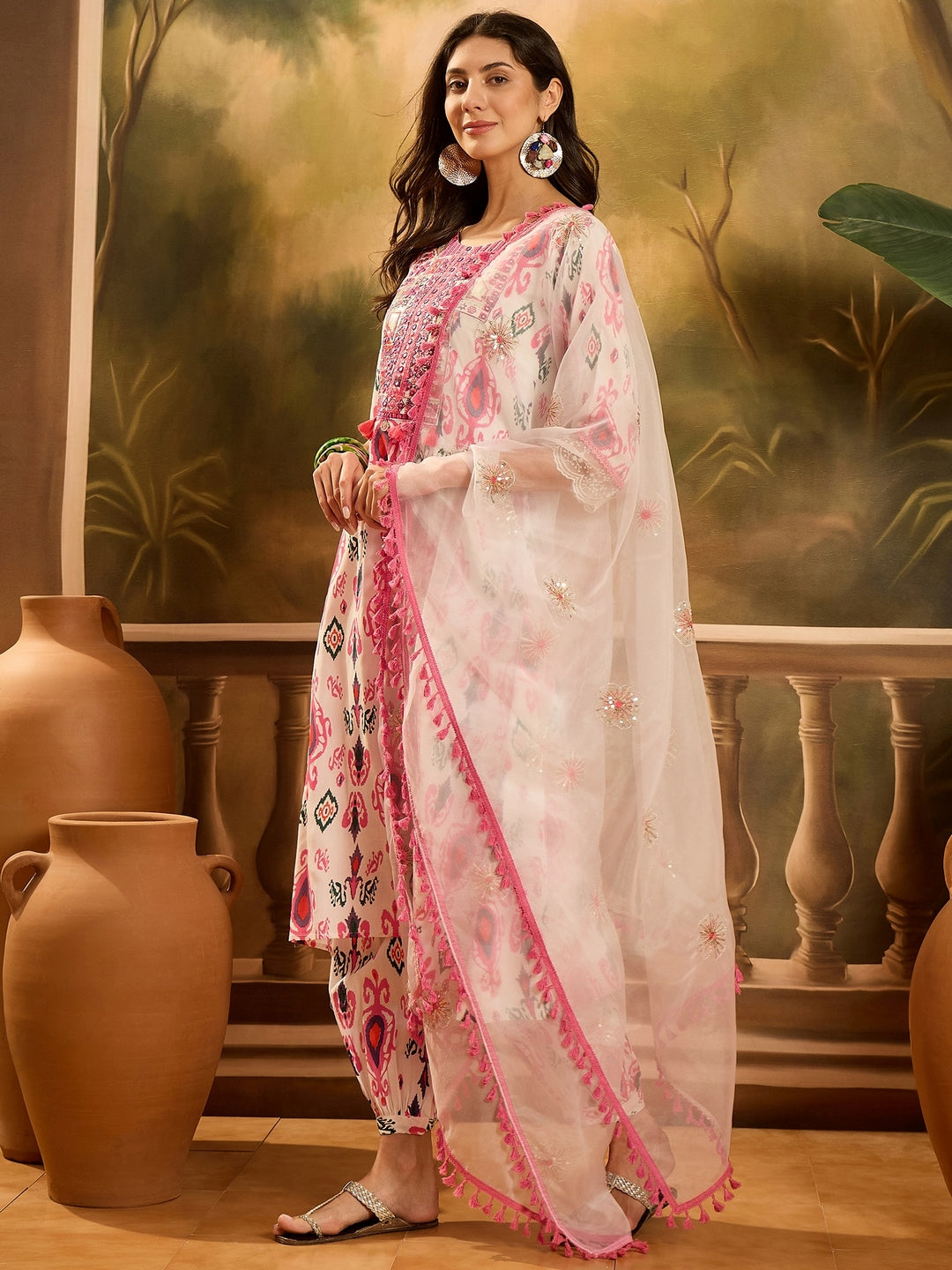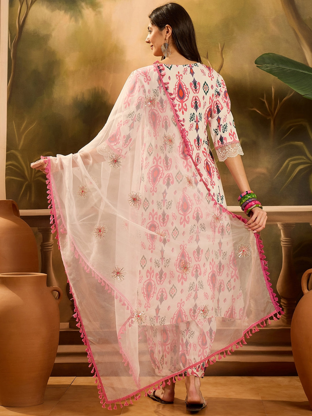 White Ikat Printed & Embroidered Rayon A-Line Kurta Pant Dupatta Set (Pre-Order)
