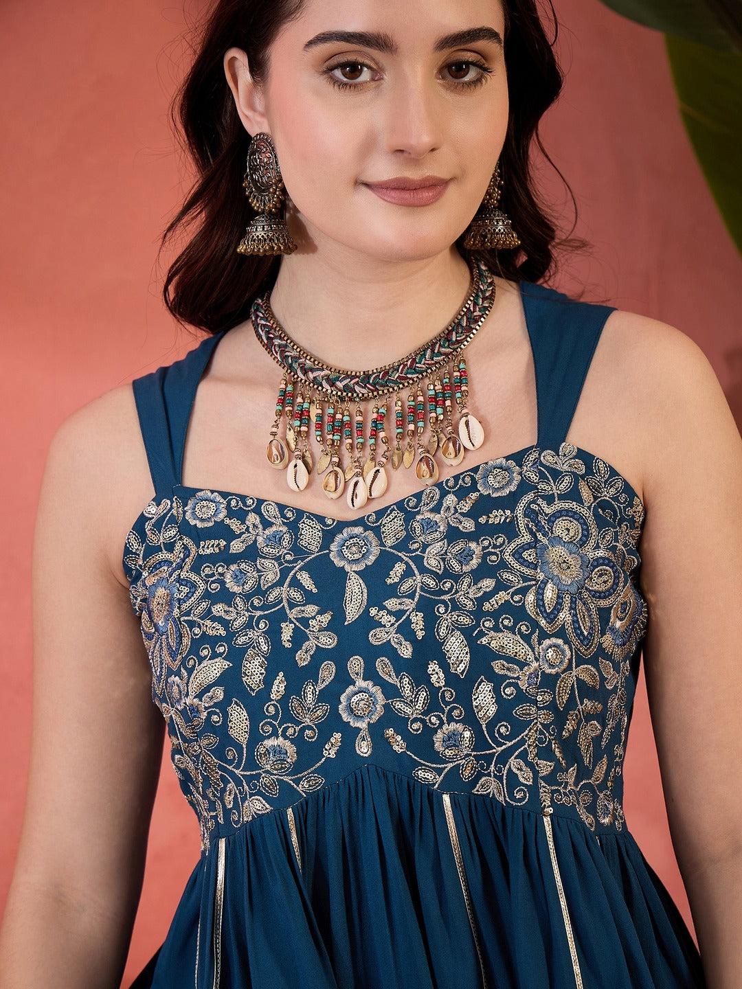 Blue Solid & Embroidered Rayon A-Line Kurti With Dhoti Pant (Pre-Order)