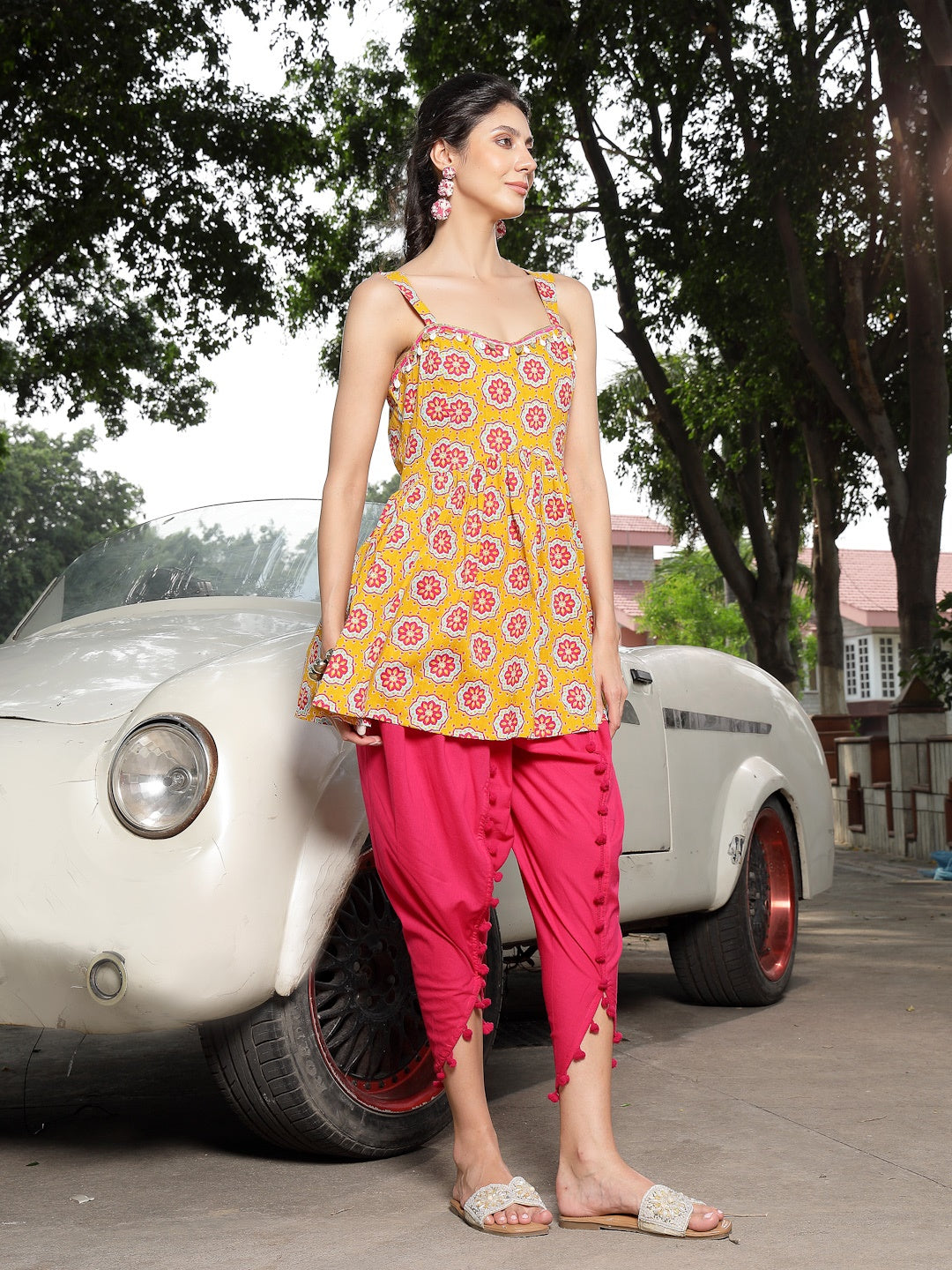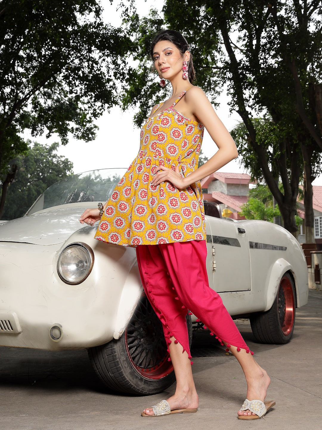 Mustard Ajrakh Printed Cotton A-Line Kurti Dhoti Pant Set (Pre-Order)