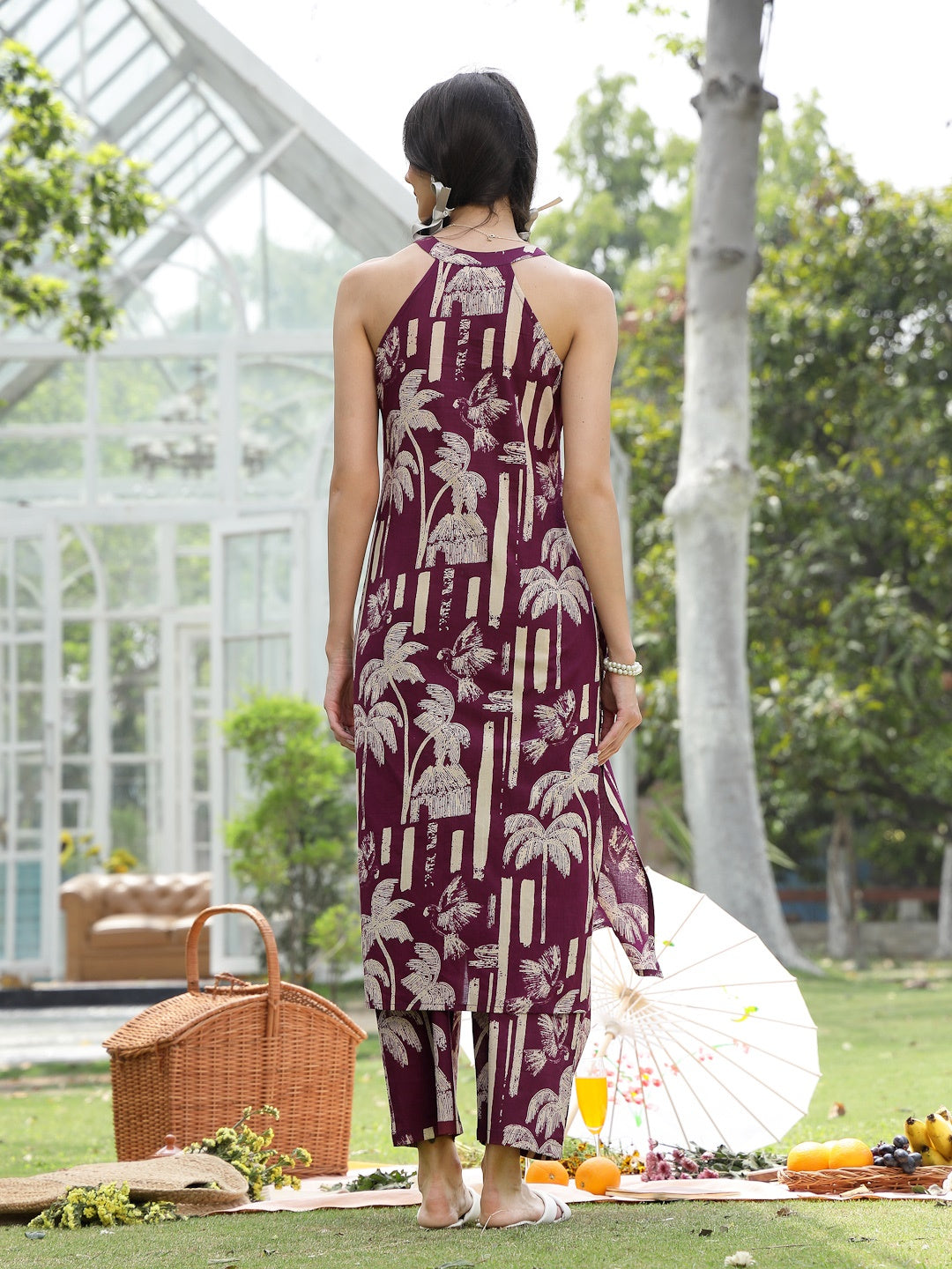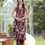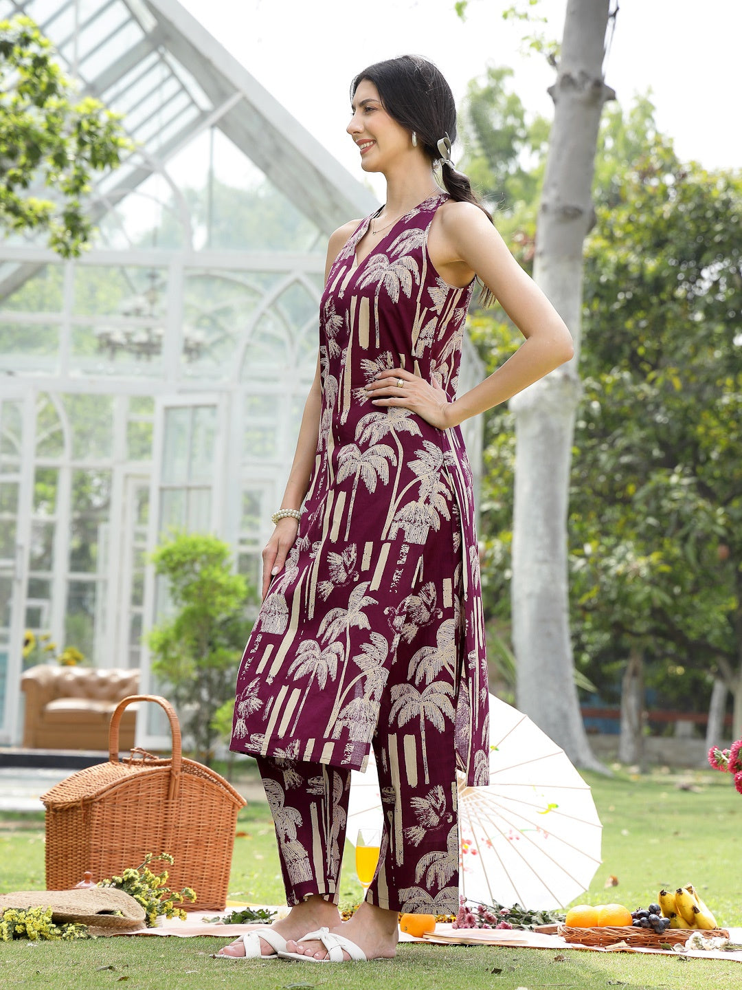 Wine Printed Cotton Straight Kurta Pant Set (Pre-Order)