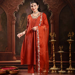 Rust Solid & Embroidered Crepe A-Line Kurta Pant Dupatta Set (Pre-Order)
