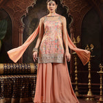Peach Floral Printed & Embroidered Silk Blend Straight Short Kurti Palazzo Dupatta Set (Pre-Order)