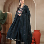 Cotton Calf Length Solid Full Sleeves Anrakha Neck Flared Kurta Suit Set With Dupatta (Pre-Order)