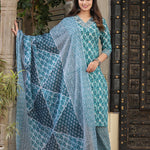 Green Straight Cotton Printed Kurta With Pant And Dupatta