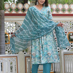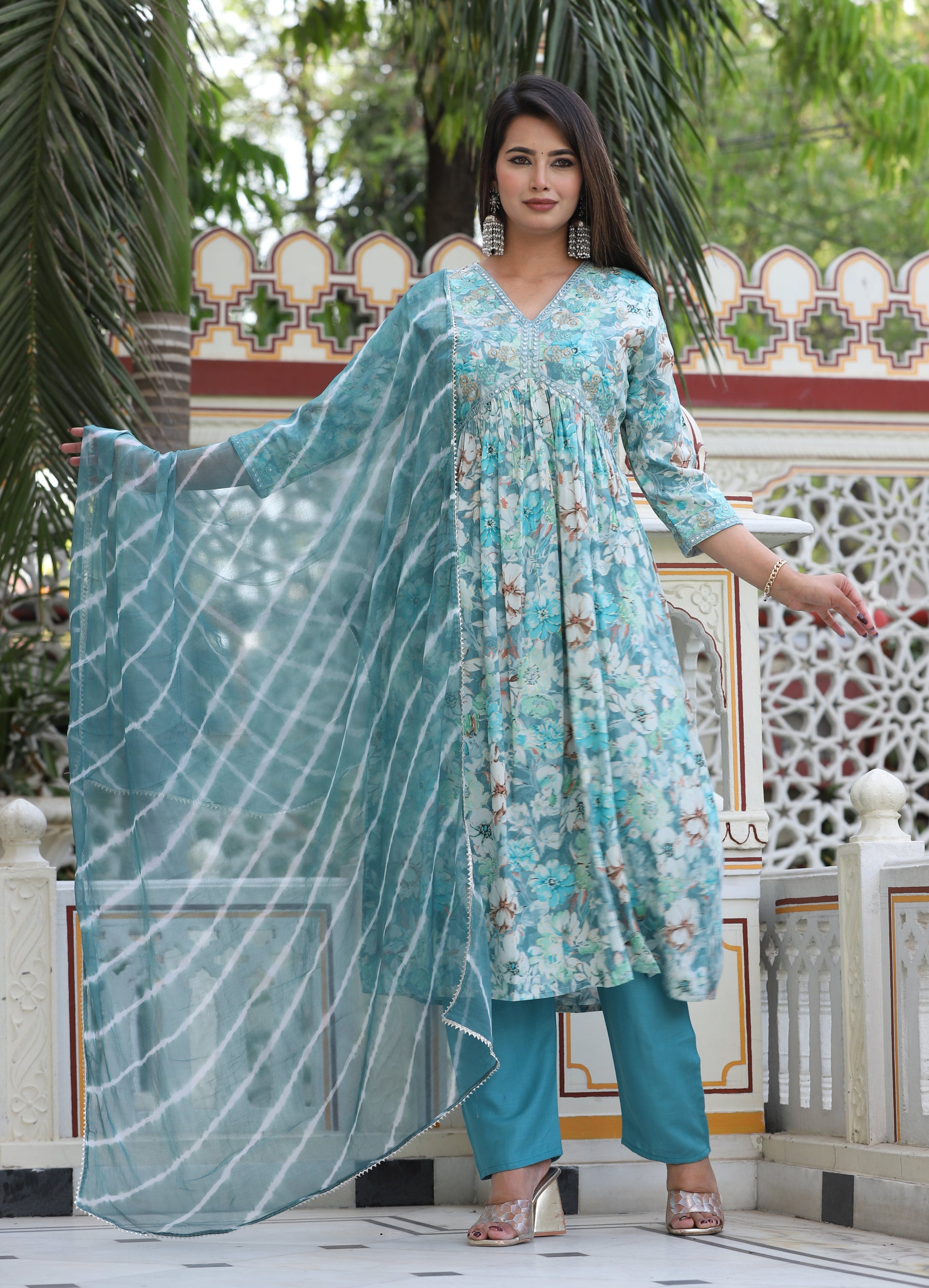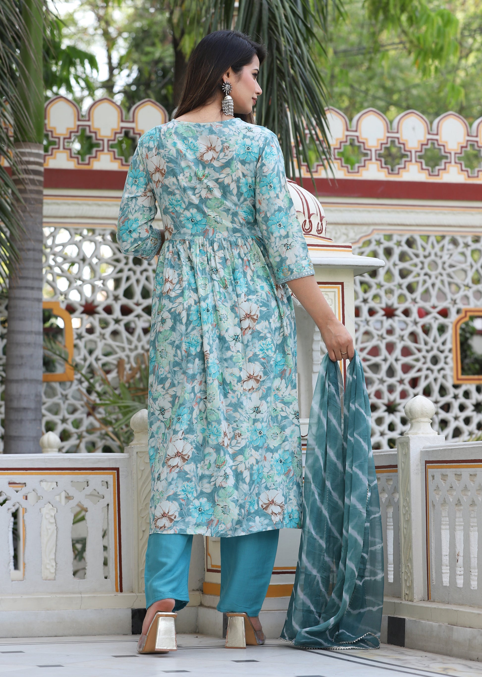 Multi Alia Cut Rayon Printd Embroiderd Kurta With Pant And Dupatta