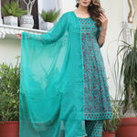 Green Anarkali Cotton Printd Embroiderd Kurta With Pant And Dupatta