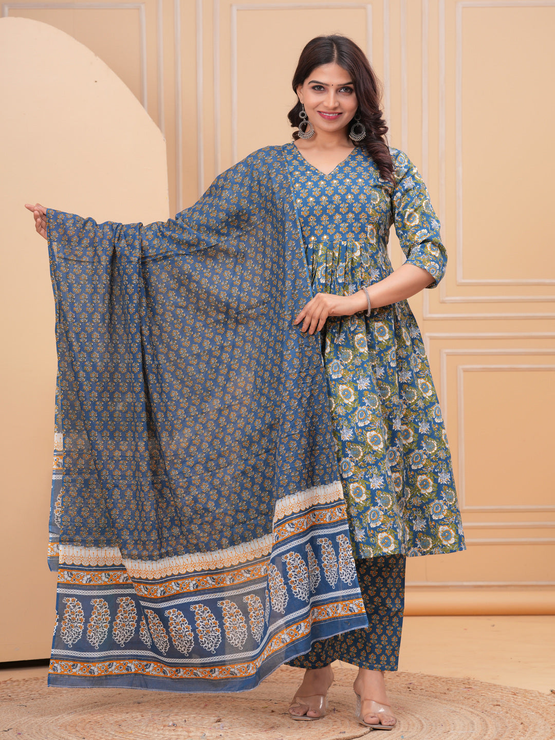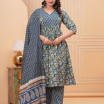 Blue Aline Cotton Printed Kurta With Pant And Dupatta