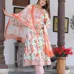 Orange Anarkali Cotton Printd Embroiderd Kurta With Pant And Dupatta
