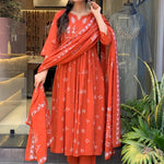 Rust Anarkali Cotton Printd Embellished Kurta With Pant And Dupatta