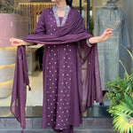 Wine Anarkali Cotton Printd Embellished Kurta With Pant And Dupatta