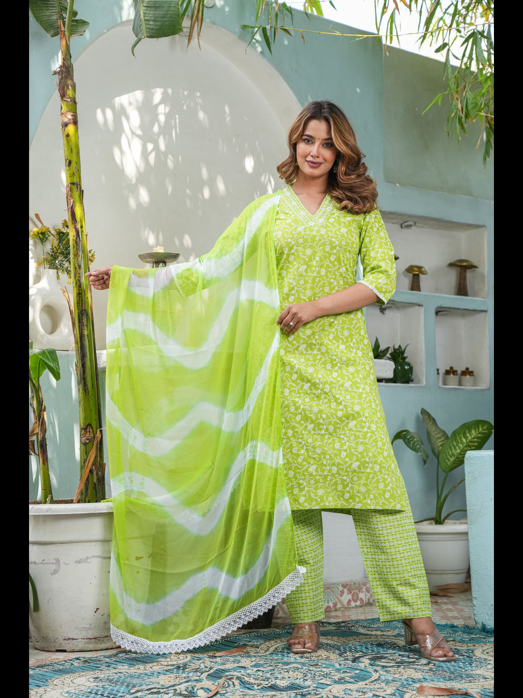 Green Straight Rayon Printed Kurta With Pant And Dupatta