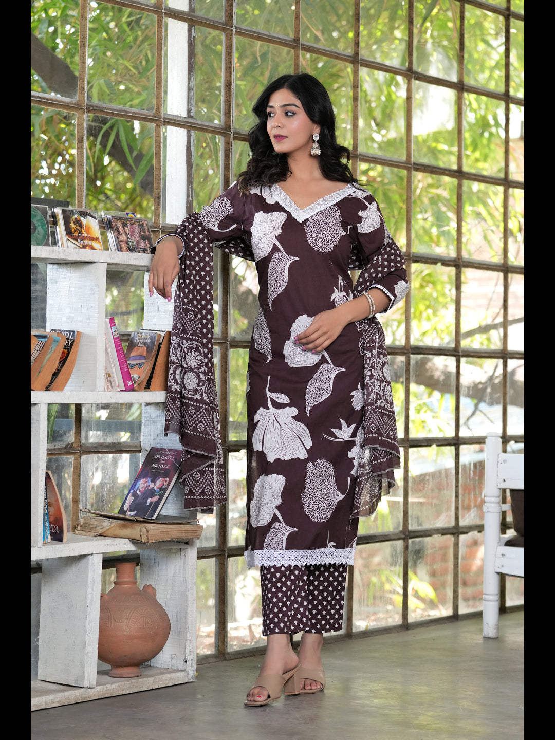 Brown Straight Printed Cotton Kurta Bottom With Dupatta