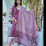 Wine Printed Straight Pure Cotton Kurta With Pant And Dupatta
