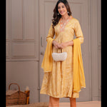 Mustard Printed A-Line Rayon Kurta With Pant And Dupatta