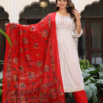 White Anarkali Rayon Printed Embroiderd Kurta With Pant And Dupatta