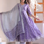 Purple Anarkali Cotton Printed Embroidered Kurta With Pant Dupatta