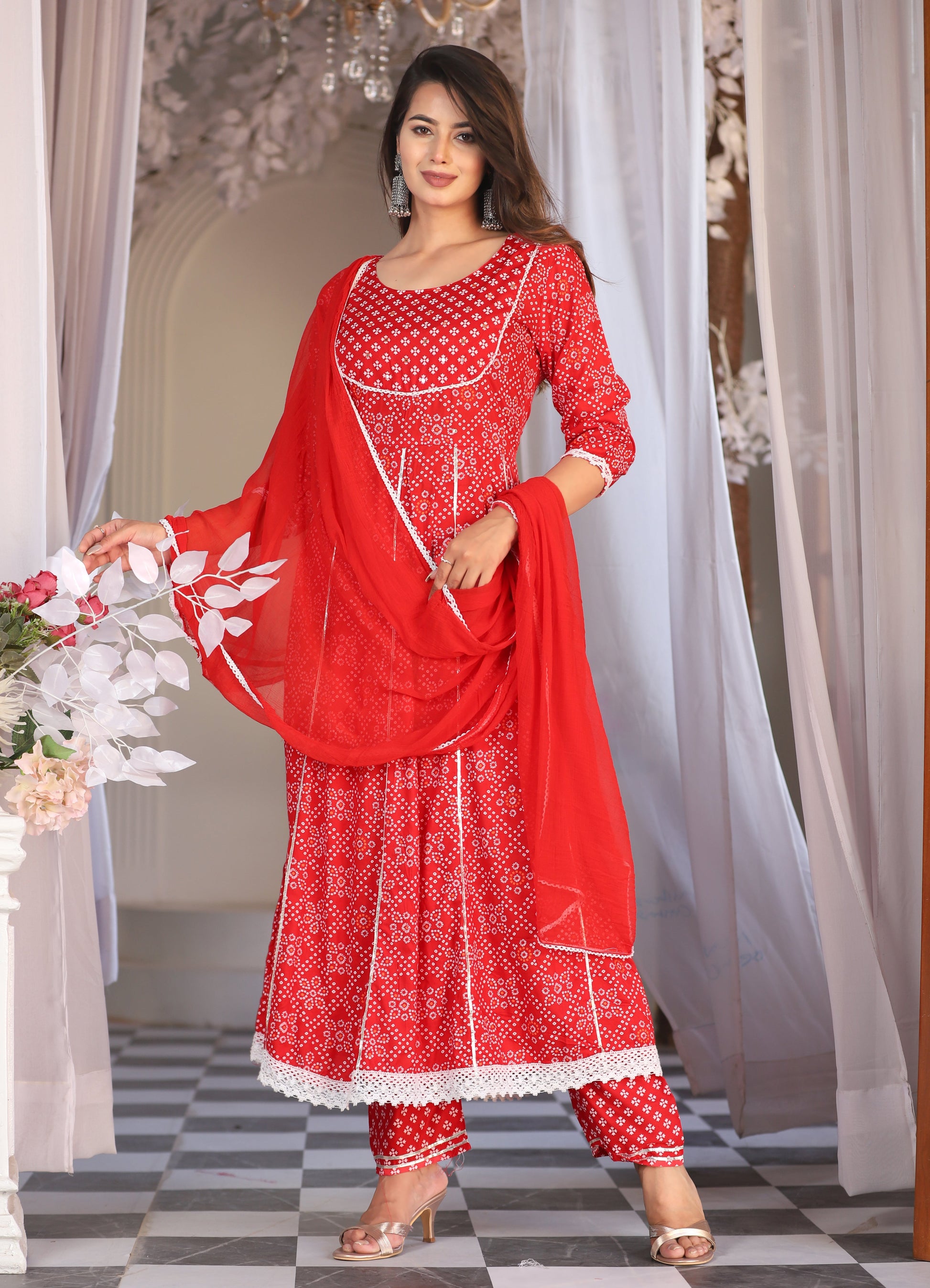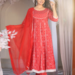 Red Anarkali Rayon Printed Embroidered Kurta With Pant Dupatta