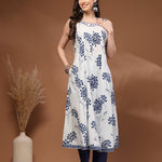 Blue Self Design Cotton 3/4 Sleeves Round Neck Calf Length Kurta Set