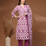 Purple Self Design Cotton 3/4 Sleeves V- Neck Calf length Kurta Bottom Set With Dupatta