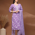 Purple Self Design Cotton 3/4 Sleeves Round Neck Calf length Kurta Bottom Set With Dupatta
