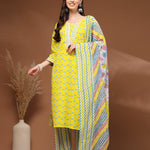 Yellow Self Design Cotton Fabric 3/4 Sleeves Round Neck Calf length Kurta Bottom Set With Dupatta
