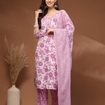 Pink Self Design Cotton Fabric 3/4 Sleeves Round Neck Calf length Kurta Bottom Set With Dupatta