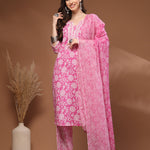 Pink Self Design Cotton Fabric 3/4 Sleeves Round Neck Calf length Kurta Bottom Set With Dupatta