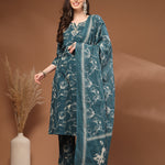 Green Self Design Cotton Fabric 3/4 Sleeves Round Neck Calf length Kurta Bottom Set With Dupatta
