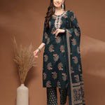 Green Self Design Cotton Fabric 3/4 Sleeves Round Neck Calf length Kurta Bottom Set With Dupatta