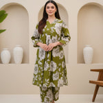 Green Self Design Cotton Fabric Long Sleeves V-Neck Calf Length Kurta Set