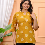 Mustard Yellow Floral Print Short Kurti With Wooden Buttons