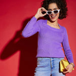 Women Lavender Rib Square Neck Full Sleeves Sweater