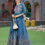 Teal Satin Embroidered Flared Lehenga Choli Sets