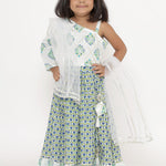 Description - Straight Style White Color Cotton Fabric Printed Choli And Blue Color Cotton Fabric Printed Lehenga With Gota Work And Net Fabric Dupatta
