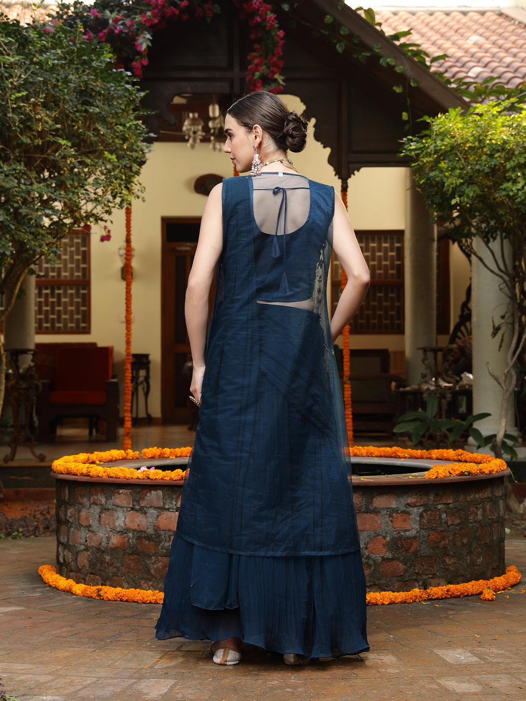 Teal Printed & Embroidered Georgette Draped Lehenga Saree & Blouse with Shrug (Pre-Order)