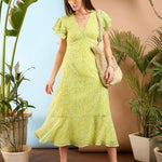 Women Lime Yellow Ditsy Floral Flared Sleeve Midi Dress