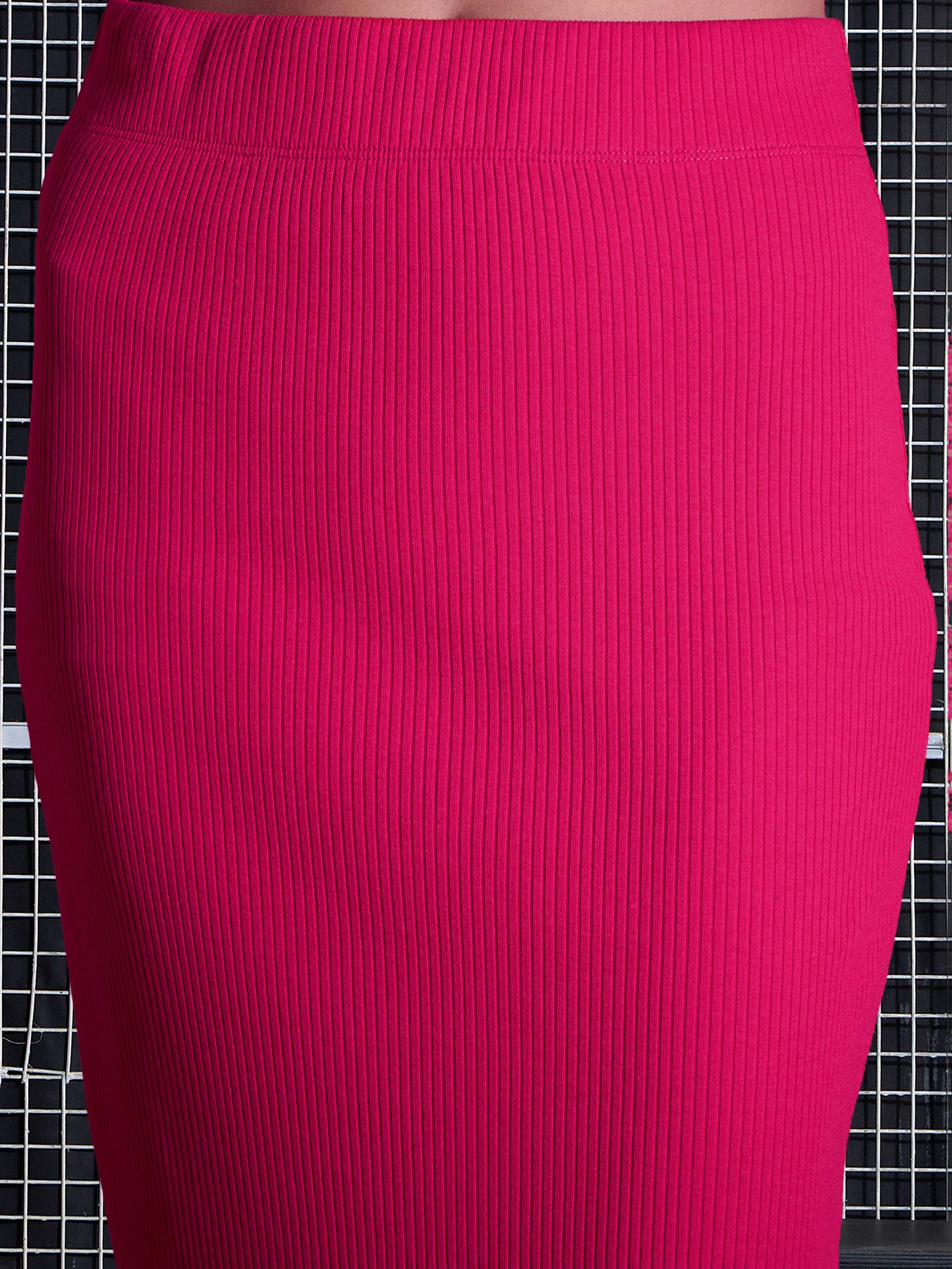 Magenta Rib Pencil Skirts, in Rib fabric, Unlined, Regular Length, Slim Fit, Elasticated Waist, Straight Hemline and features Slit Detail At Side