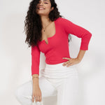 Women Magenta Rib V-Neck Top