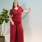 Women Maroon Button Down Top With Straight Pants