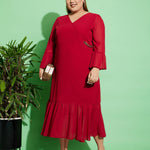 Maroon Chain Detail Wrap Dress, in Georgette fabric, Polyester Lining, Below Knee, Fit & Flared, Zipper Closure, Straight Hemline and features Metal Chain Detail At Front