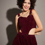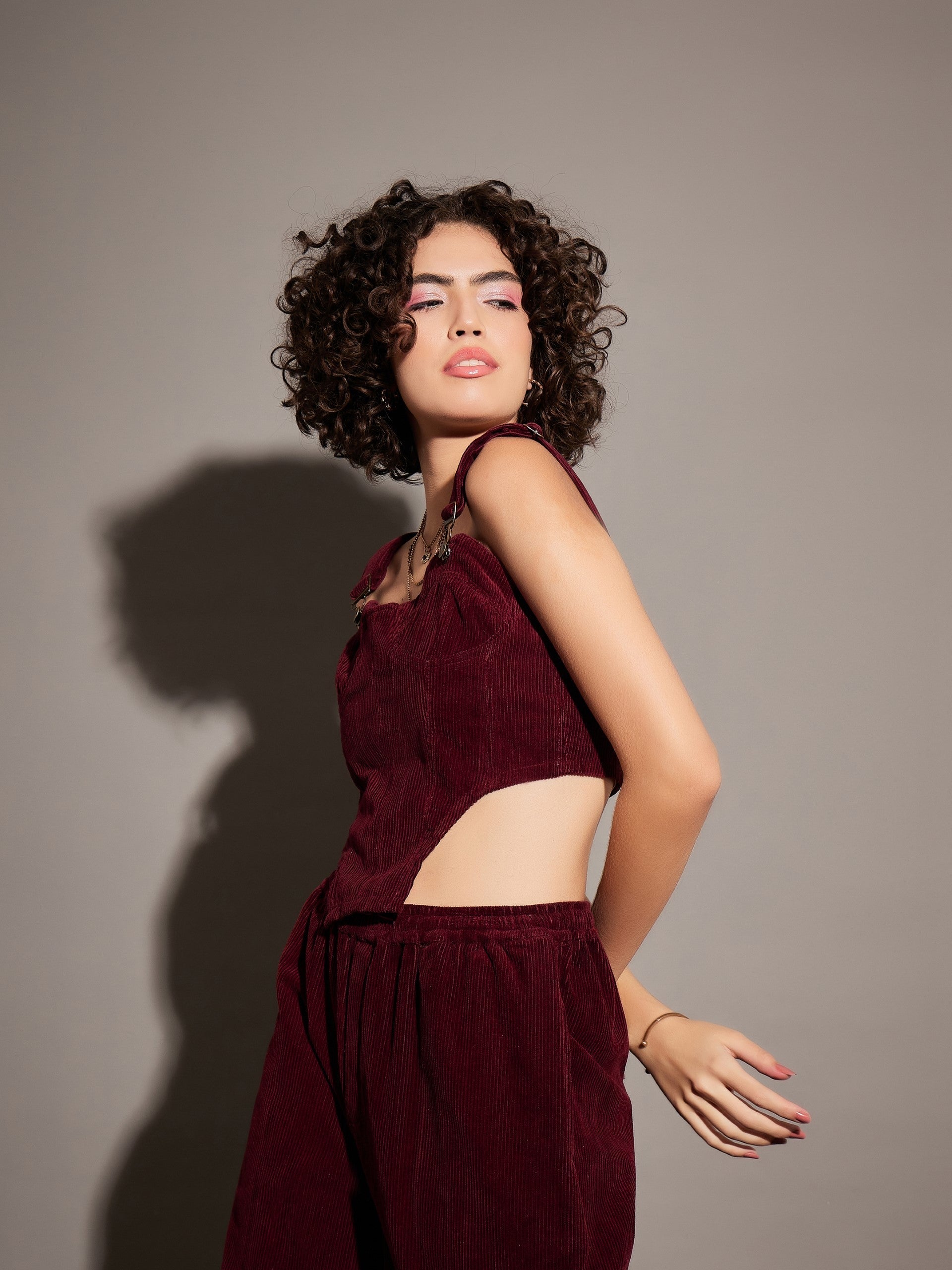 Maroon Corduroy Bustier Crop Top, in Corduroy fabric, Unlined, Crop Length , Slim Fit, Zipper Closure, Straight Hemline and features Metal Adjuster Detail At Straps
