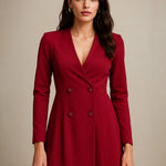 Maroon Double Breasted Short Dress, in Canton Knit fabric, Unlined, Above Knee, Regular Fit, Button Closure, Straight Hemline and features Self Fabric Button Detail
