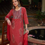 Women Maroon Floral Front Yoke Kurta With Pencil Pants & Dupatta
