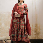 Women Maroon Floral Tiered Kurta With Pencil Pant & Dupatta