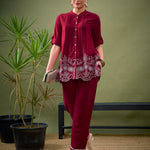 Maroon Hem Embroidered Shirt With Palazzos, in Rayon fabric, Unlined, Regular Length, Comfort Fit, Button Closure, Straight Hemline and features Embroidery Detail At Hem