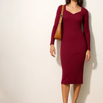 Maroon Rib Sweetheart Neck Knee Dress, in Rib fabric, Unlined, Below Knee, Bodycon, No Closure, Straight Hemline and features Sweetheart Neck Detail