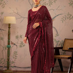 Women Maroon Sequins RTW Draped Saree With Unstitched Blouse